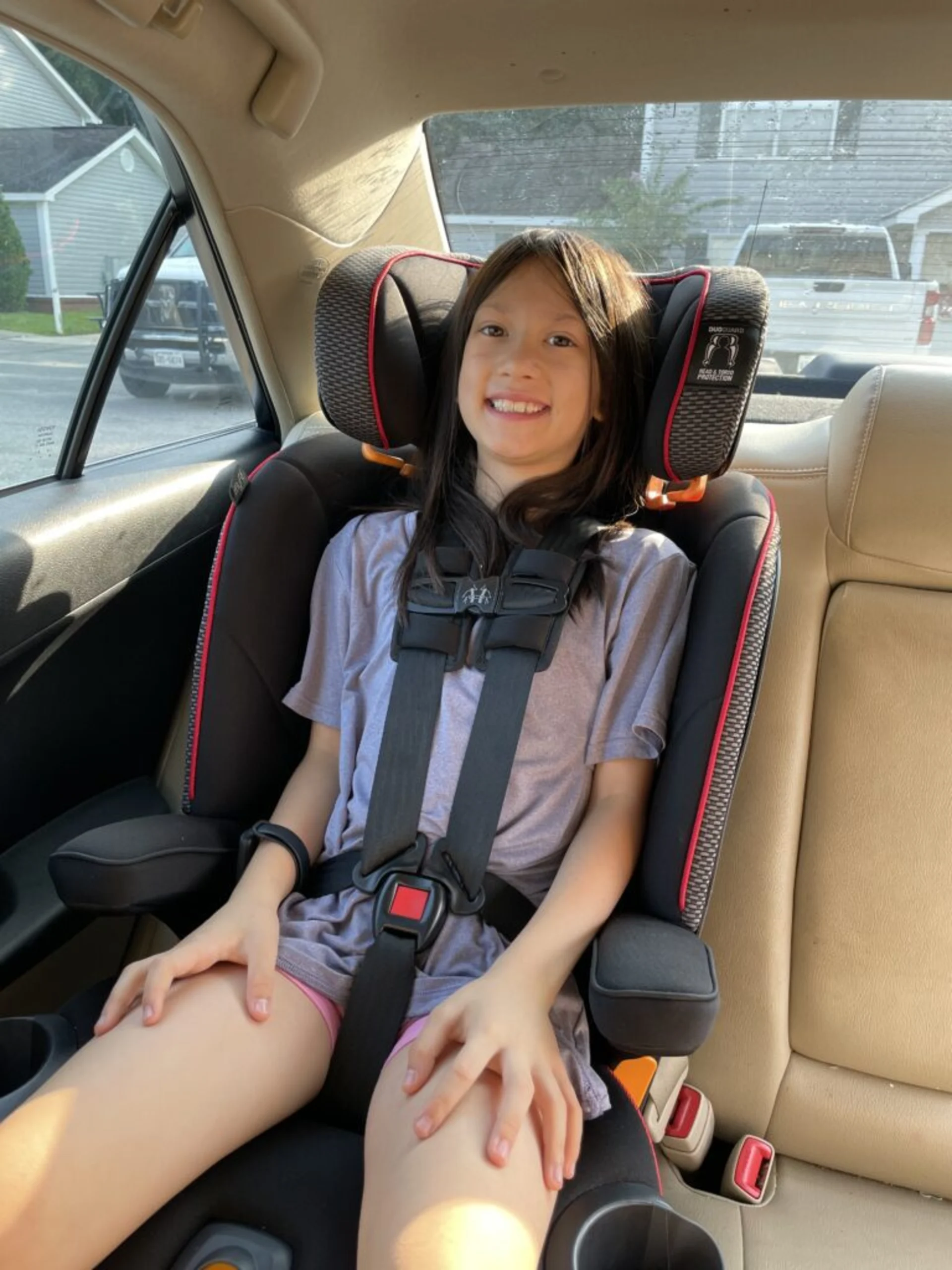The Chicco MyFit is a great option for tall kids, as it has a high standing height limit and a tall harness height. It can also be a good choice for some 3 across situations as well since it is only 17.5″ when the cup holders are folded in. However, caution should be exercised if your vehicle has non-removable headrests, as the seat may not be compatible in high-back booster mode.