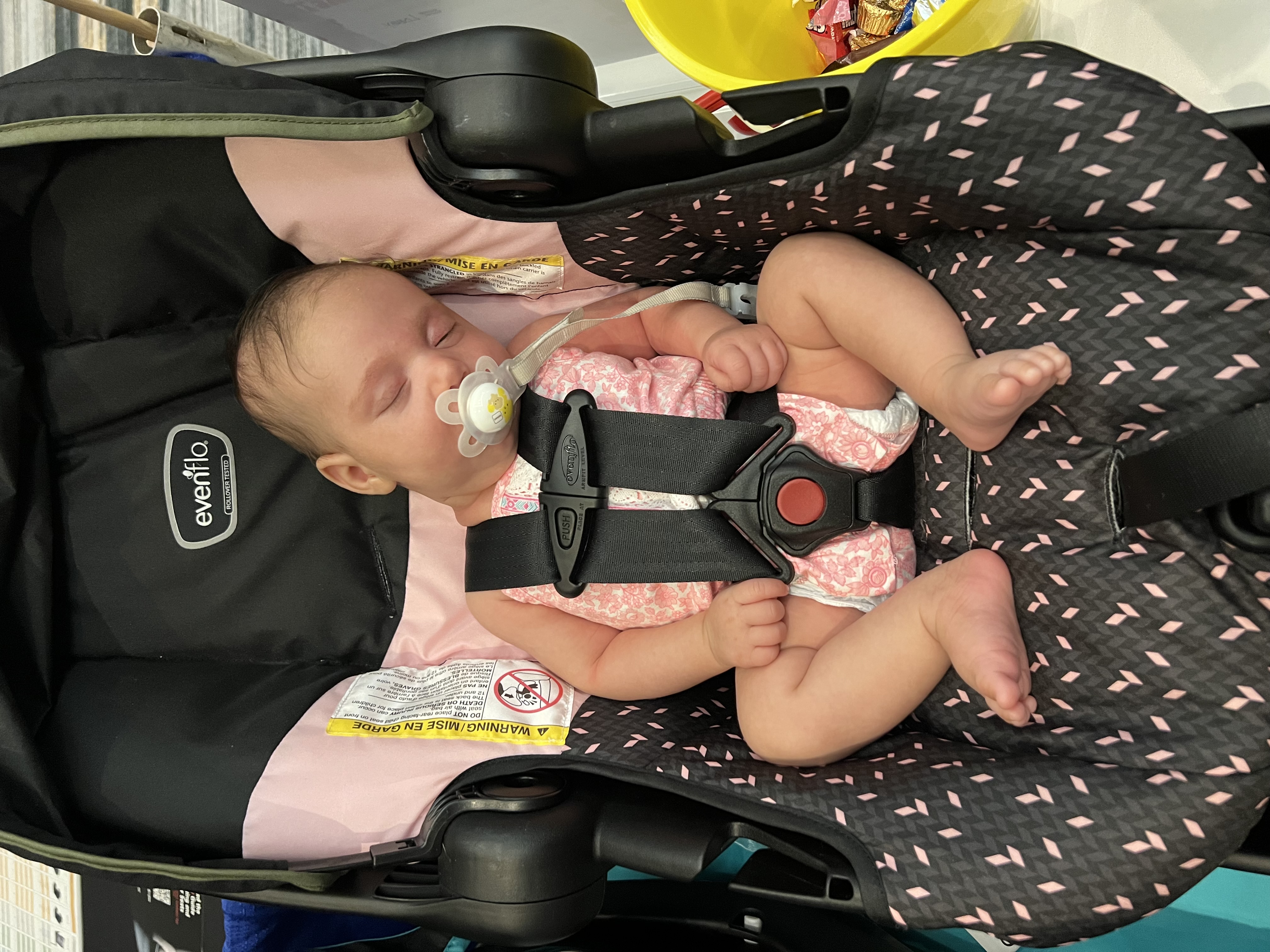 This car seat is an excellent option if you’re expecting a small newborn or bringing home a preemie. A newborn in the Evenflo NurtureMax car seat will fit no matter how big or small! The lowest harness height is about 5″, so the shoulder straps are sure to fit in the proper position on the tiniest of babies.