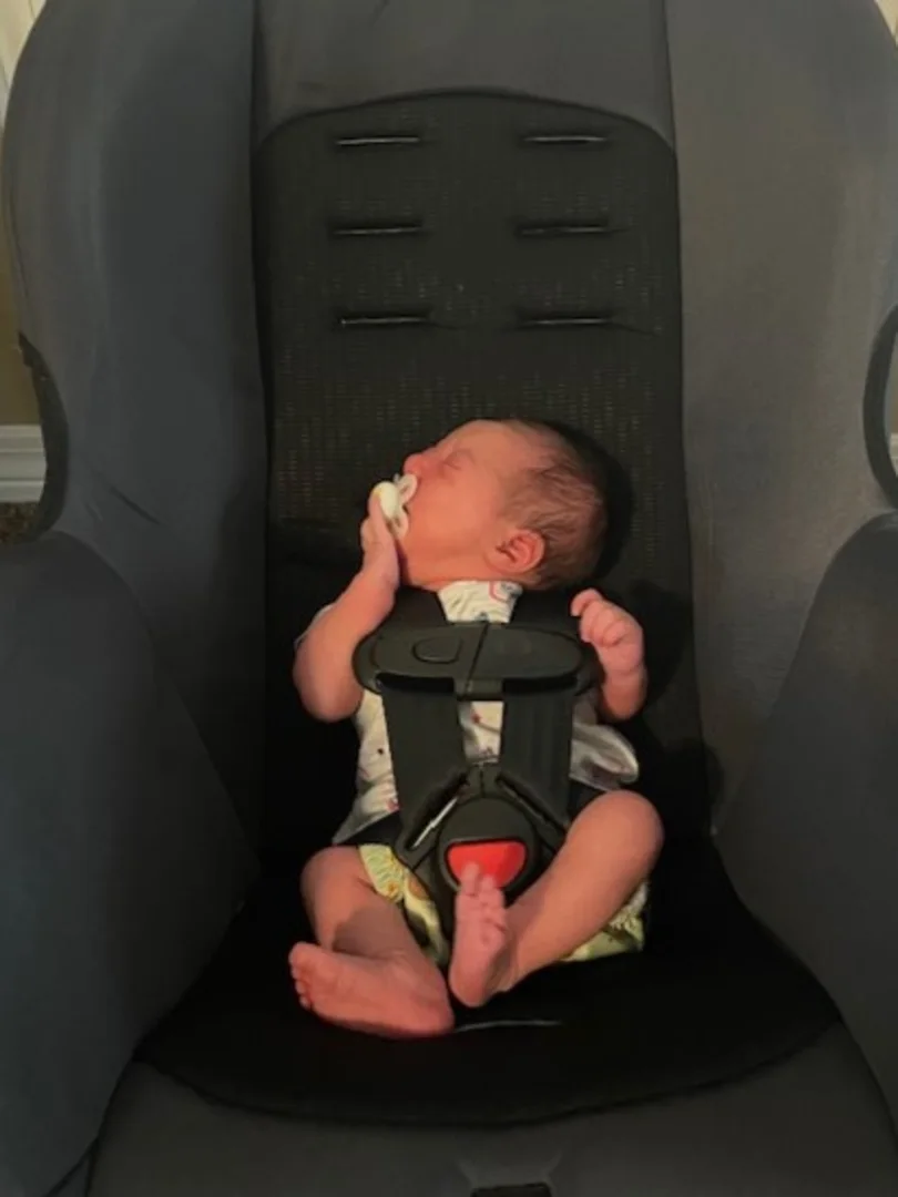 We were able to try a 5-day-old baby in the Evenflo Titan 65. At birth, she was 7.5 pounds, 20.5 inches. Her fit was excellent. This seat does have a 19" minimum height limit, so that's something to be mindful of if you are planning to use it from birth. We had to use the shorter harness loops and use the newborn crotch buckle setting for a proper fit. But these adjustments were easy to make. Baby's head positioning here is perfect. It's important to remember that you a baby's head does not need to be immobilized. Do not be tempted to add extra padding around a newborn's head.