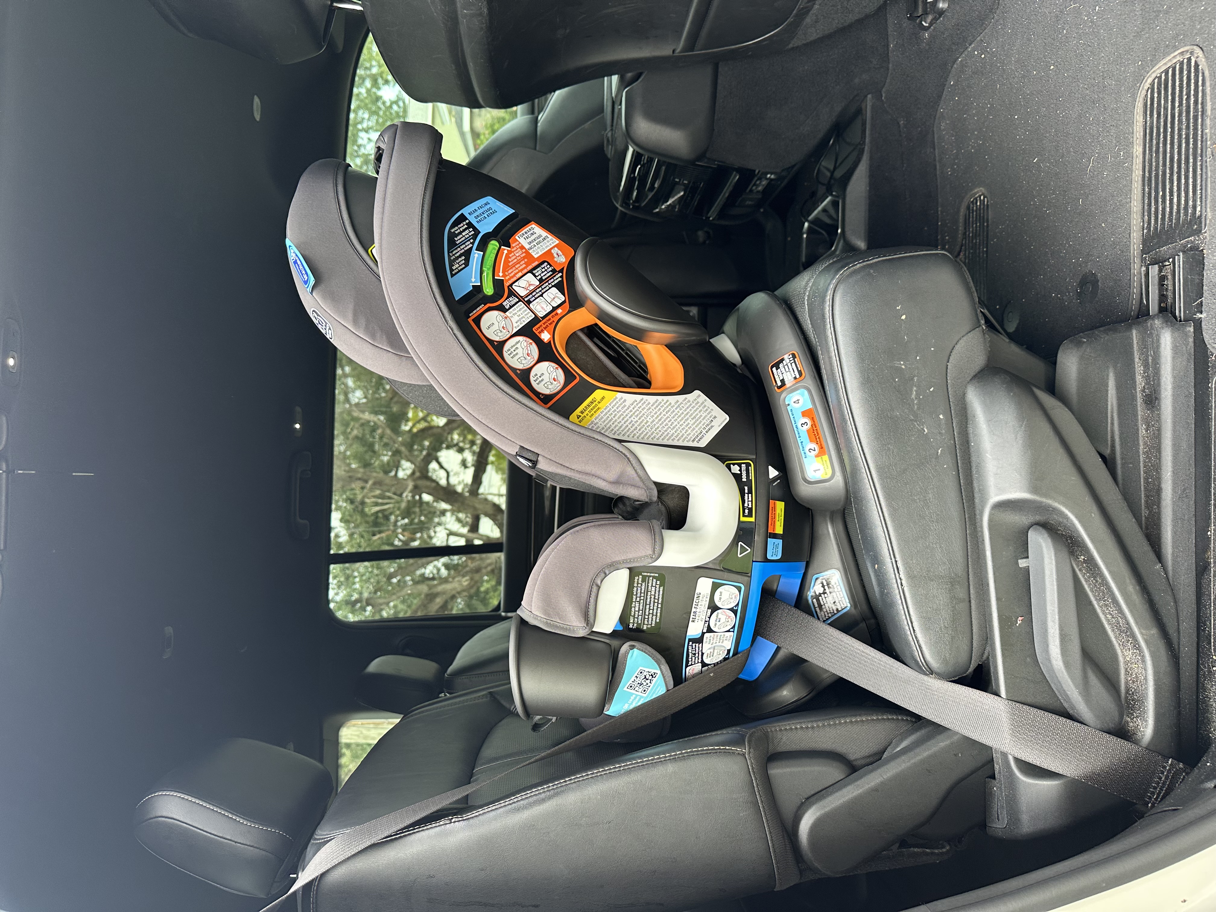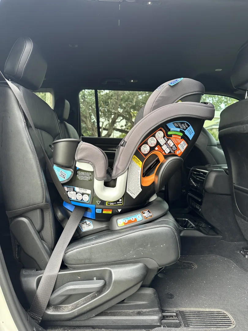 The Graco Turn2Me is one of the best rotating car seats for small cars because it is very compact front-to-back. Because the seat has numerous recline positions, it can get very upright, which lessens the footprint of the seat from front to back. If you have a tall driver or passenger or are just really tight on that legroom in the second or third row of your vehicle, this seat is a good option.