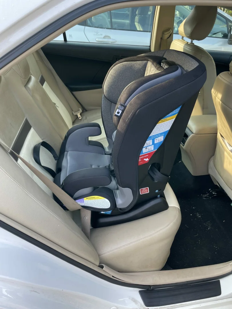 Since this seat is only 17″ wide, it can fit 3 across in some vehicles. It doesn’t have any ease of installation features, so it’s not as easy to install 3 car seats with this seat, but it is doable. Above, you can see 3 across in a 2012 Toyota Camry with a Safety 1st EverSlim, Safety 1st SlimRide, and Evenflo Litemax. You may need to try different configurations in order to fit seats 3 across in your vehicle. See our blog here for more narrow car seat options and our YouTube video.