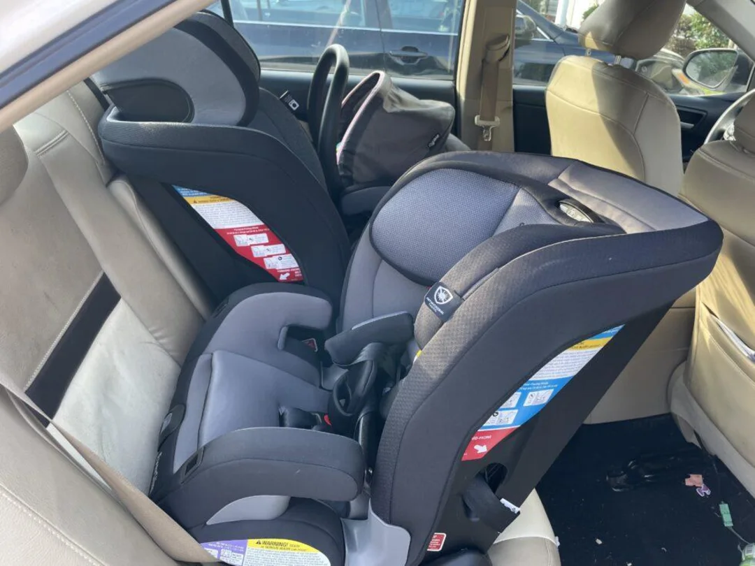 Since this seat is only 17″ wide, it can fit 3 across in some vehicles. It doesn’t have any ease of installation features, so it’s not as easy to install 3 car seats with this seat, but it is doable. Above, you can see 3 across in a 2012 Toyota Camry with a Safety 1st EverSlim, Safety 1st SlimRide, and Evenflo Litemax. You may need to try different configurations in order to fit seats 3 across in your vehicle. See our blog here for more narrow car seat options and our YouTube video.