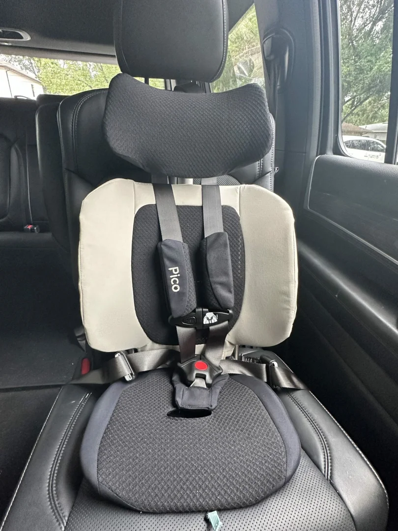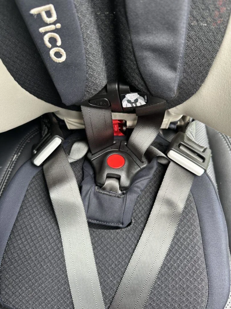 The Pico has a single harness height. This is a very unique design. We’re all used to adjusting our children’s harness heights as they grow! Instead, users will adjust the headrest height to properly contain the child’s head, while the harness height stays the same. For smaller kids, this can create a bit of an awkward-looking fit, with the harness several inches higher than the child’s shoulders. Don’t worry! This is how the seat is designed, and it’s safe as long as the harness is tightened properly.